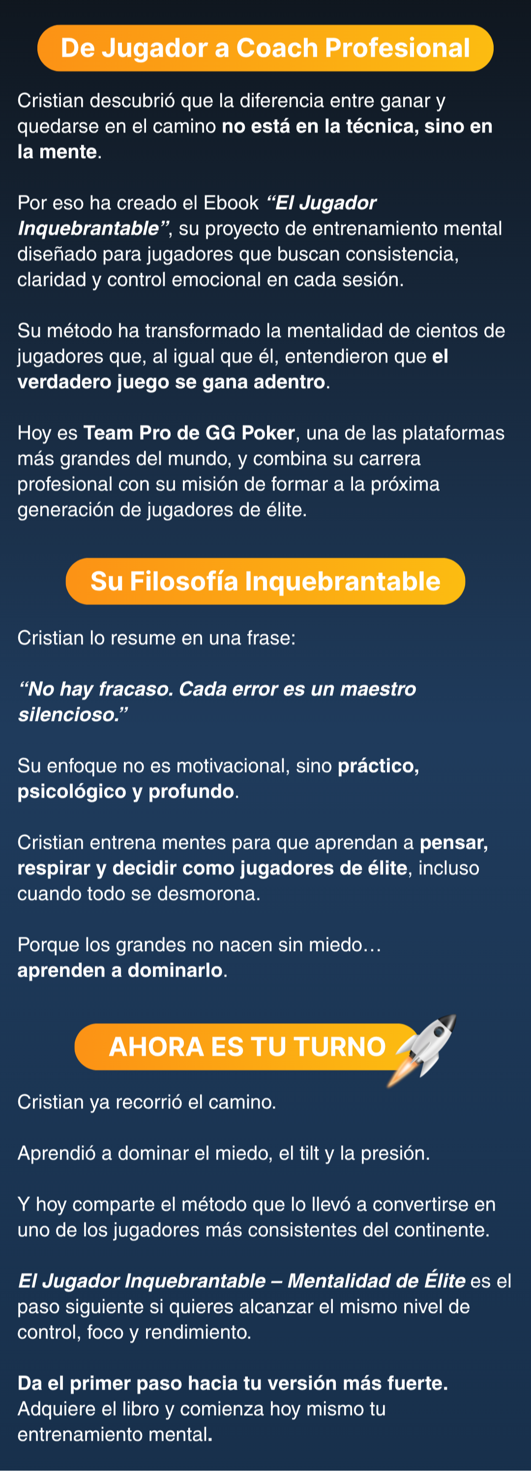 Está basado en más de 15 años de experiencia jugando póker profesional y entrenando a jugadores que hoy ya transformaron su mentalidad y su juego. Tú también puedes lograrlo.