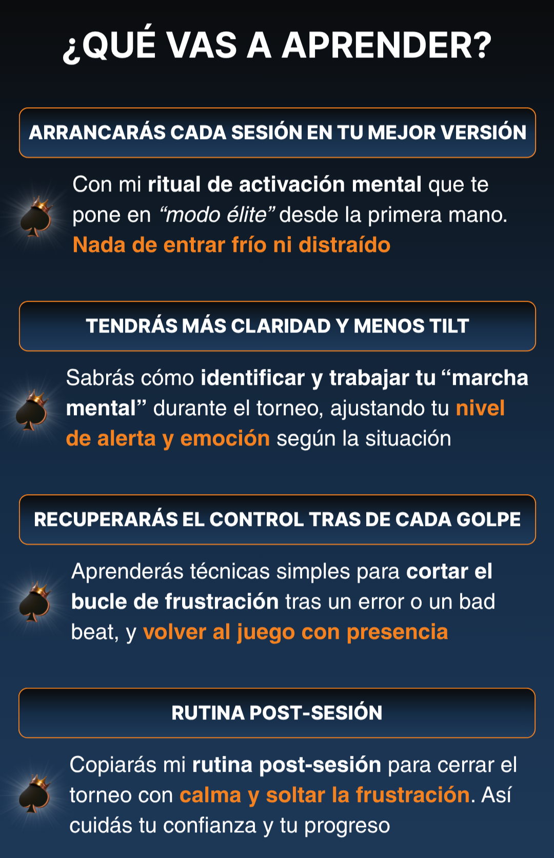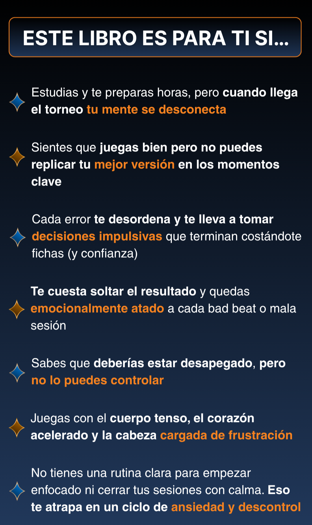 Este sistema se adapta a tu nivel, porque todos los jugadores —sin importar su experiencia— enfrentan lo mismo: tilt, miedo, frustración y desconexión mental.