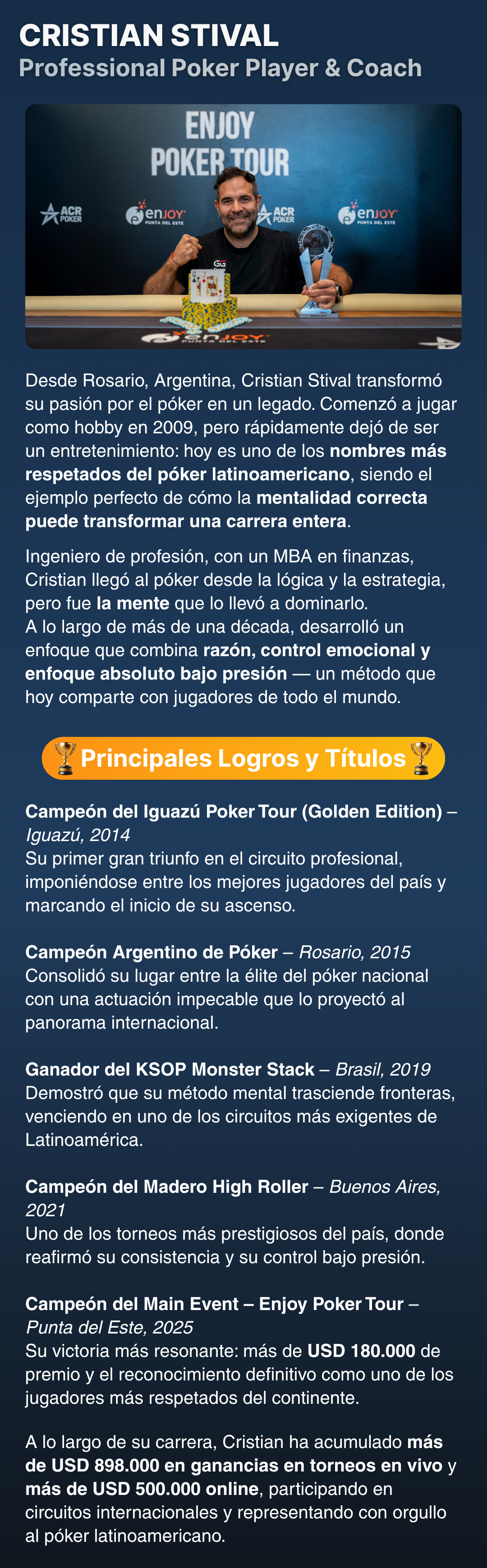 Cristian Stival no solo compitió y ganó torneos, sino que construyó un método basado en experiencia real y psicología aplicada al poker.